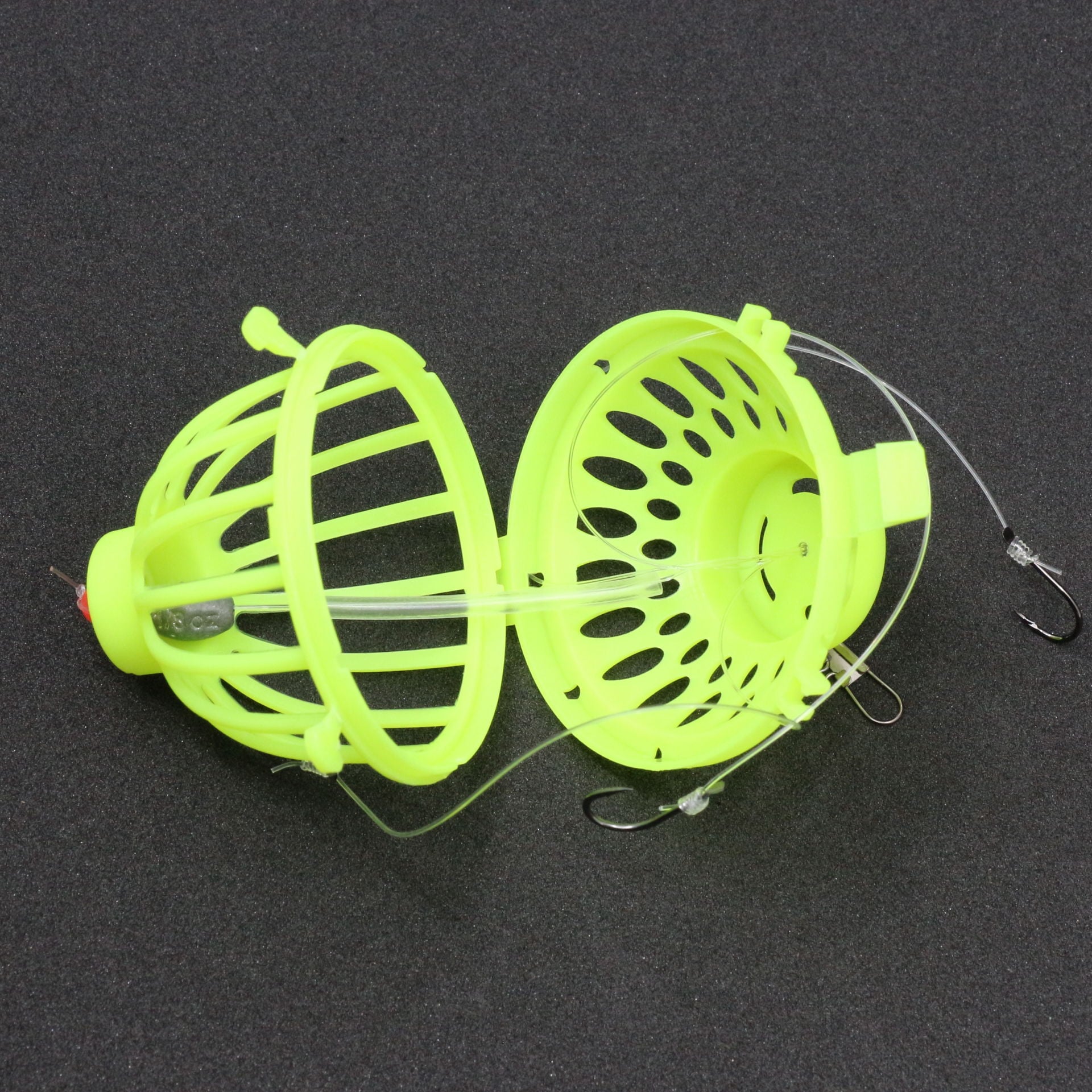 Teçhizat, plastik bir besleyici sepet, ana hatta bağlanmak için klipsli fırdöndü ve kısa uçlara bağlanan üç kancadan oluşur.