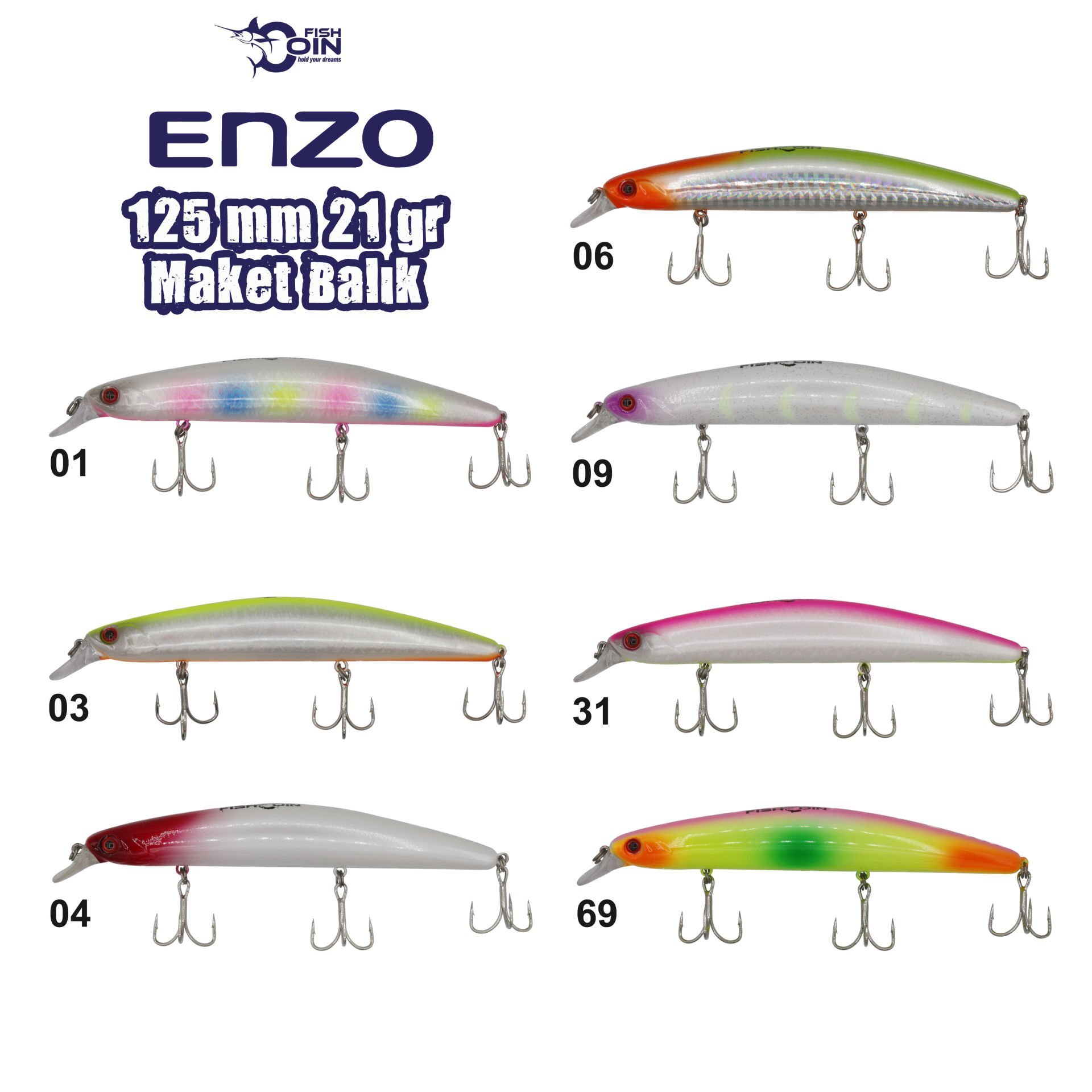 21 gr ağırlığında olan Enzo modeli mükemmel atış erimine sahiptir. 12,5 cm boyu ile Levrek, Lüfer, Sarıkanat, Baraküda gibi avcı balıkların yakalanmasında kullanıma uygundur. UV renkleri ve floating özelliği ile vazgeçilmeziniz olmaya aday.