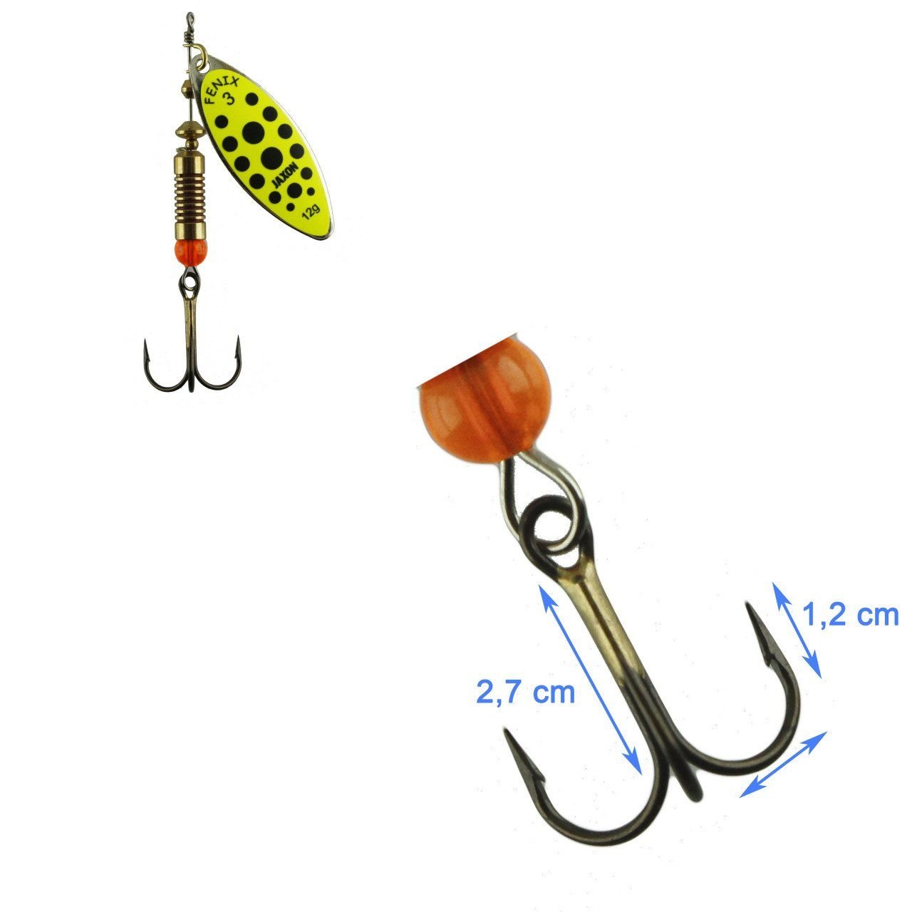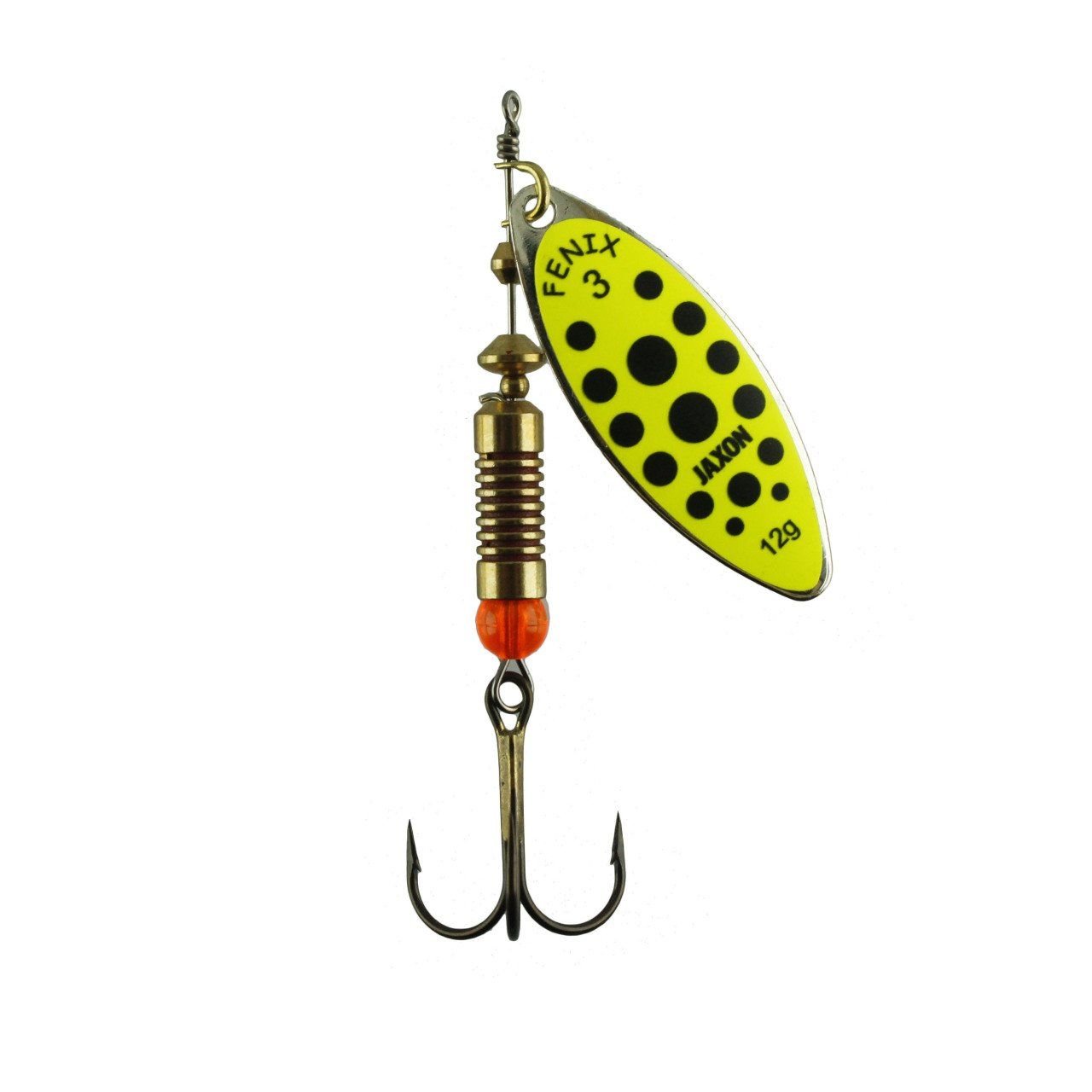 Jaxon Holo Select Fenix Meps Döner Kaşıkların da kullanılan Turuncu Boncuk özellikle Alabalığın menüsünde bulunan Yusufçuk Böceğindeki renkler dikkate alarak döner kaşıklara konumlandırılmıştır.