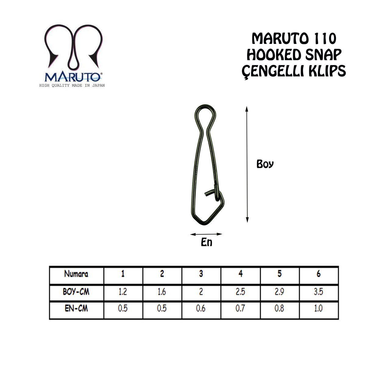 Maruto 110 Klipsleri çengelli yapısı sayesin de hem oltalarınızı seri bir şekilde değiştirebilmenizi sağlar hem de büyük balık avcılıklarında mükemmel bir dayanıklılık gösterir.