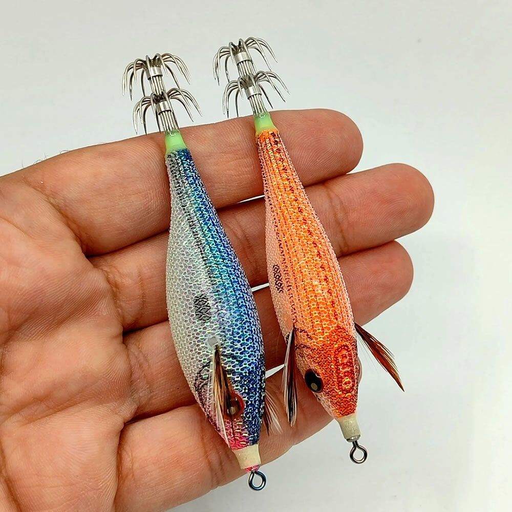 Floresan renkli parlak sık dokulu keten balık pulu benzeri kumaş kaplama glow gövde tasarımına sahip kalamar zokası.